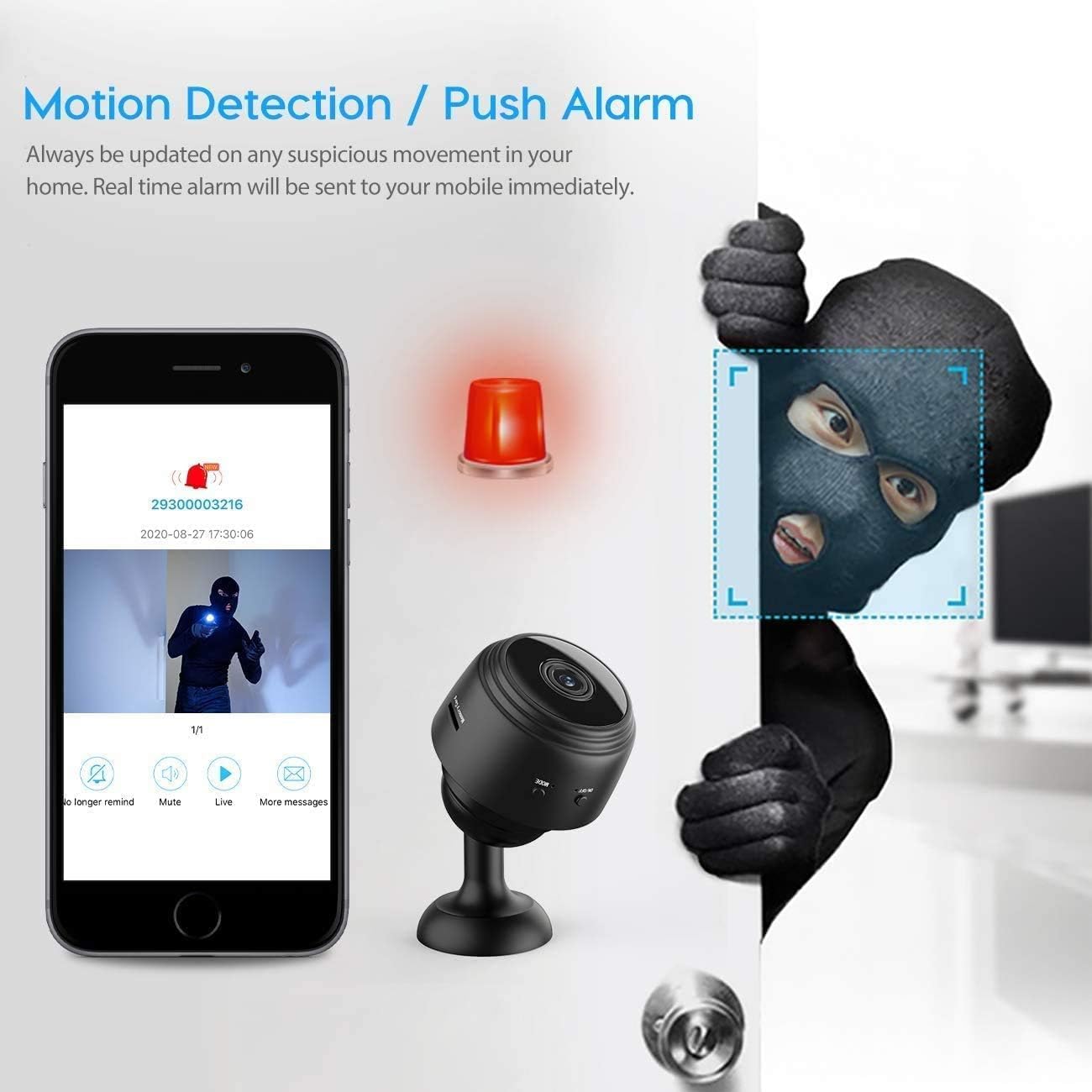 - Motion Detection and Night Vision - With the upgraded intelligent motion detection, now you can set the sensor sensitivity manually. Once a motion is detected, the mini camera will send Push Notification with images to your phone. You can log into the App to see what’s going on in real time and never worry about missing something important. The device features covert design of 6 infrared IR lights with non-luminance and 5M night vision distance. You can remotely switch it on/off in the App.