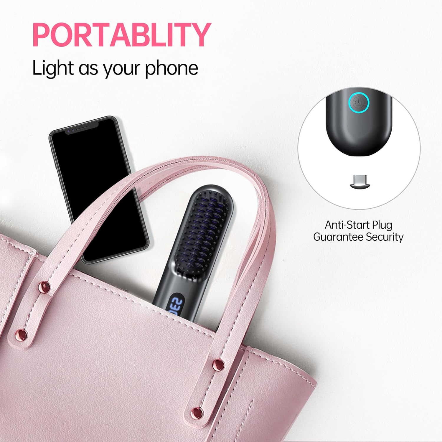 - [Cordless&Worry-Free] Combining lightweight portability with the freedom of cordless use, hair straightening brush allows you to style your hair anytime, anywhere, eliminating the hassle of tangled wires. Weighing no more than your phone, the brush comb glides effortlessly through your strands, keeping your hair straight all day long. (Tip: To prevent accidental touch, need 2-second long press switch to turn on)